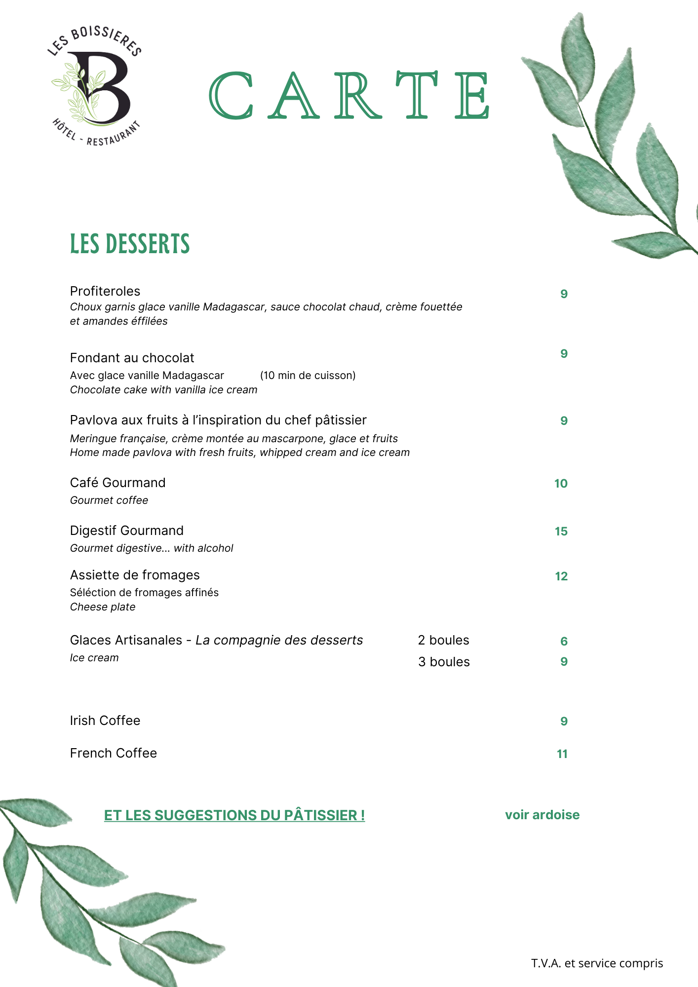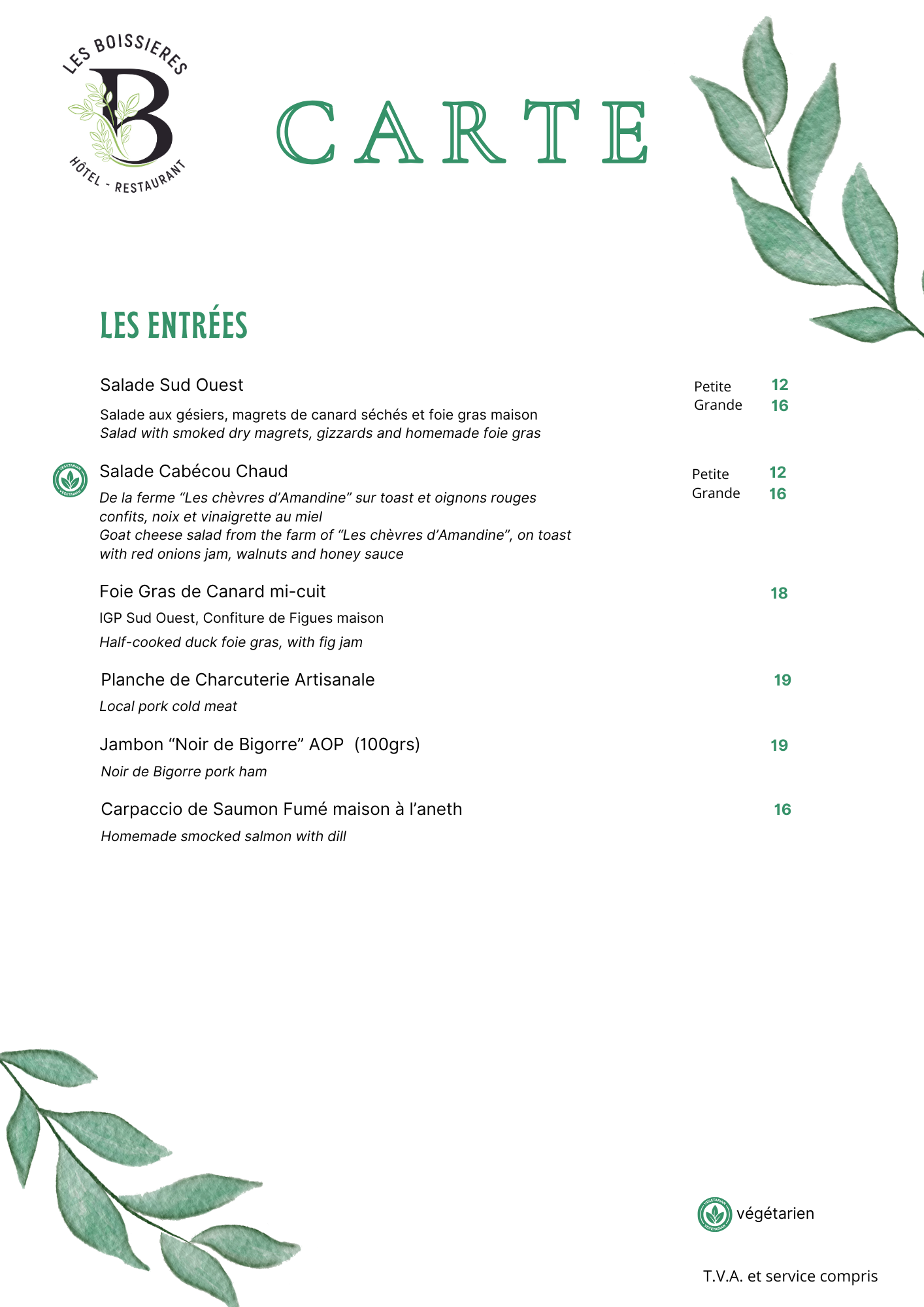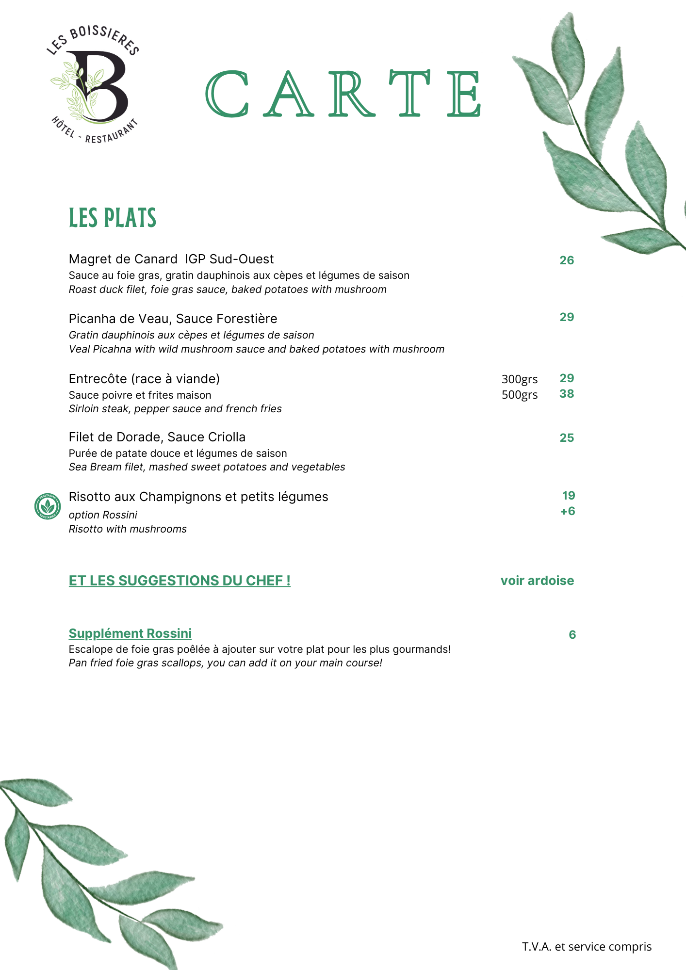 Nous travaillons uniquement des produits frais, par conséquent la disponibilité de certains produits peut nous contraindre parfois à des changements dans nos menus. De même nous proposons des suggestions à l'ardoise chaque semaine et qui ne sont disponible qu'en quantité limitée!